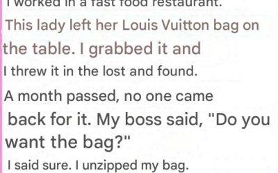 Una vez, mientras trabajaba en un restaurante de comida rápida, descubrí un bolso Louis Vuitton de mujer sobre la mesa.…