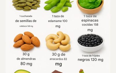 Enriquece tu dieta diaria con deliciosas fuentes de magnesio: semillas de calabaza, edamame, espinacas, almendras, aguacate, plátano y chocolate negro. ¡Ingredientes naturales que benefician tu cuerpo a diario!