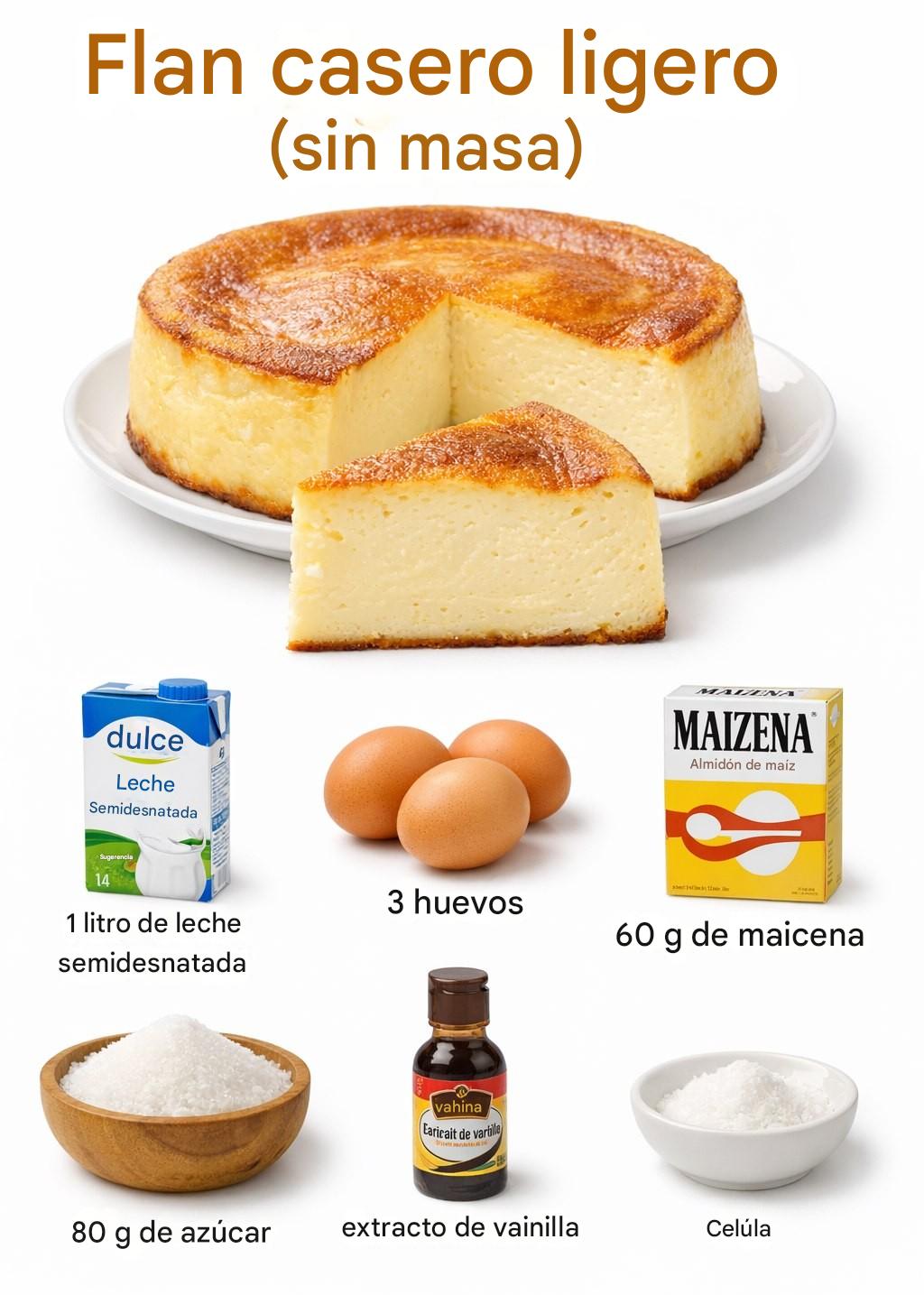 Aprende a preparar un postre saludable fácilmente con nuestra receta de flan ligero. Necesitarás: 1 litro de leche semidesnatada, 3 huevos, 80 g de azúcar, 60 g de maíz, 1 cucharadita de extracto de vainilla y una pizca de sal.