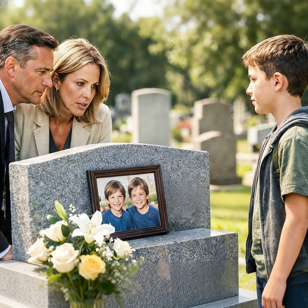 El chico no los miraba a ellos. Estaba frente a una tumba unos metros atrás, con la cabeza inclinada, sosteniendo algo entre las manos. como si fuera un tesoro frágil. Lucía apenas lo notó. Victor tampoco habría prestado atención de no haber sido por lo siguiente. El niño, al escuchar que Victor decía nuestros hijos levantó los ojos con un gesto que no debería haber significado nada, pero lo significó todo. Y entonces ocurrió. El niño dio unos pasos hacia ellos, no con la confianza de quien quiere hablar, sino con la cautela de alguien que teme equivocarse.